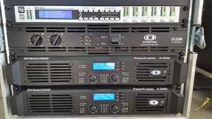 Angetrieben wir das System mit eine Dynacord H5000, einer Dynacord LX2200 Endstufe und einem ElectroVoice DC-One Lautsprechermanagement Prozessor.